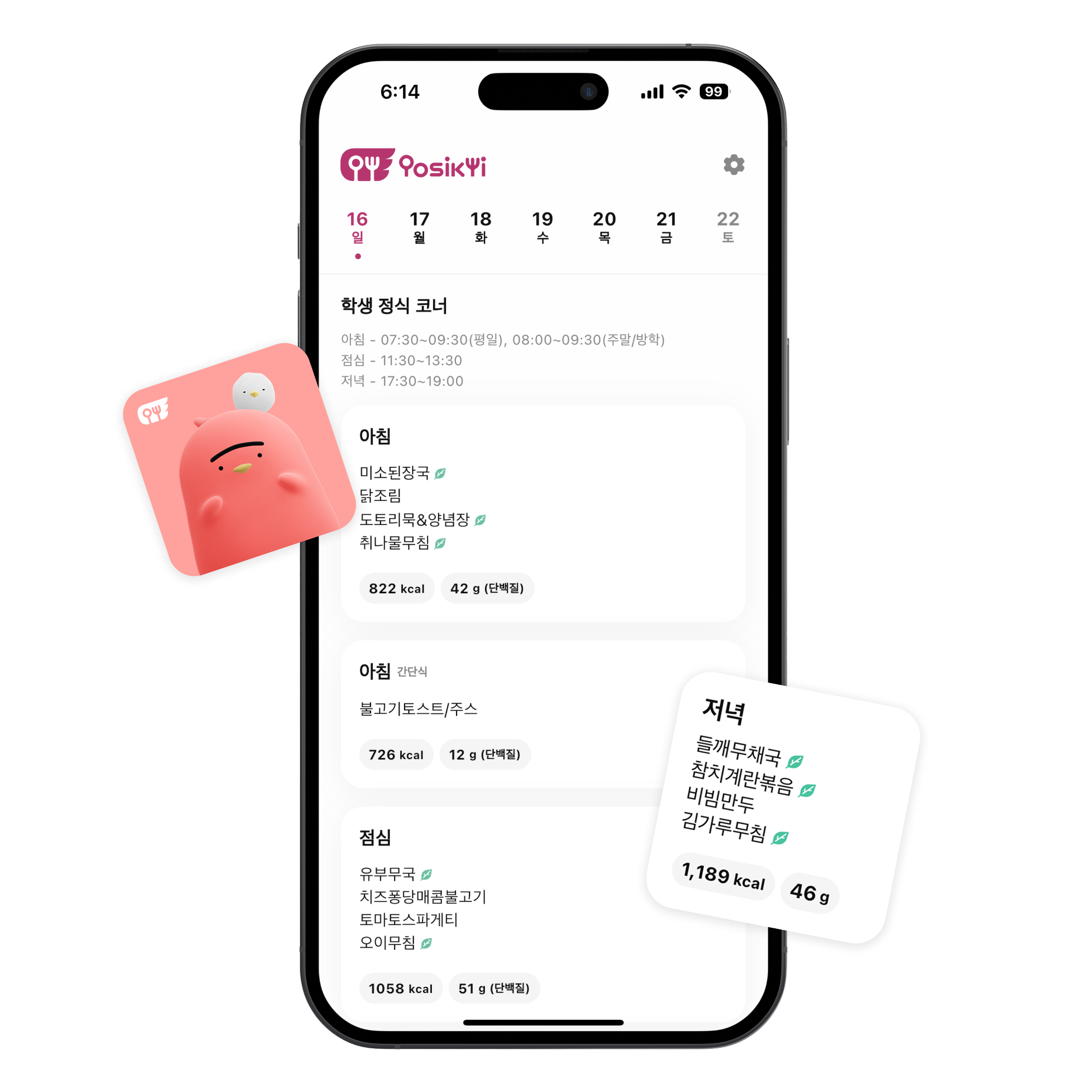 요일별 학식 메뉴와 칼로리, 단백질 정보를 한번에!